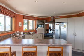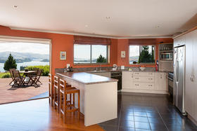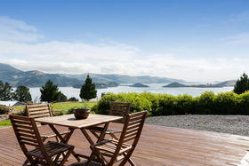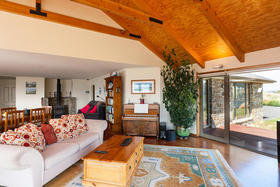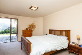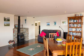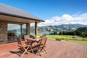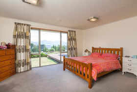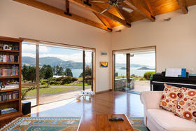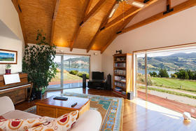 The spacious living with its Cathedral timber ceiling, West Coast Rimu floors and indoor-outdoor flow, all soaking in the stunning views, is sure to impress.